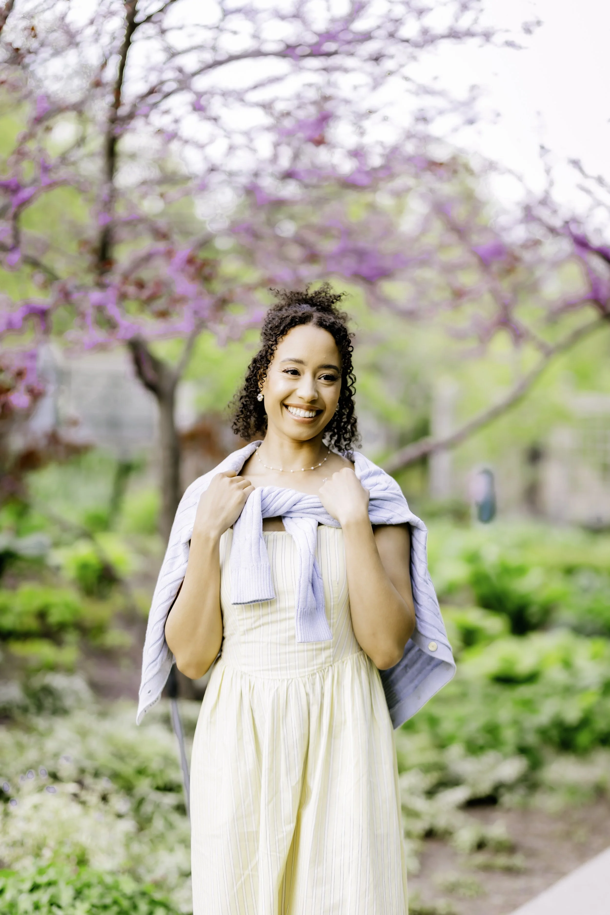 Tiffiny’s look was the embodiment of soft elegance. She wore a flowing, sun-kissed yellow midi dress with delicate pinstripes that moved beautifully with the breeze. Draped casually over her shoulders was a light blue sweater — a subtle, preppy touch that added depth and charm to her already graceful ensemble. Paired with pearl accessories, a natural curly updo, and minimalist white heels, her look was fresh, romantic, and effortlessly chic.